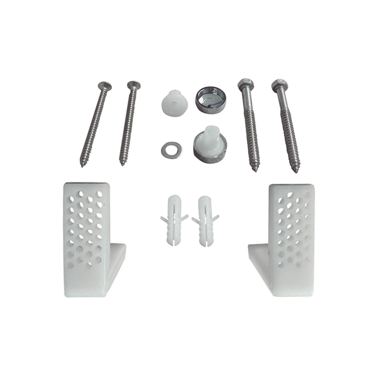 Incluye 2 soportes en L fabricados en polipropileno, tarugos y tapas de abs y tornillos de acero inoxidable